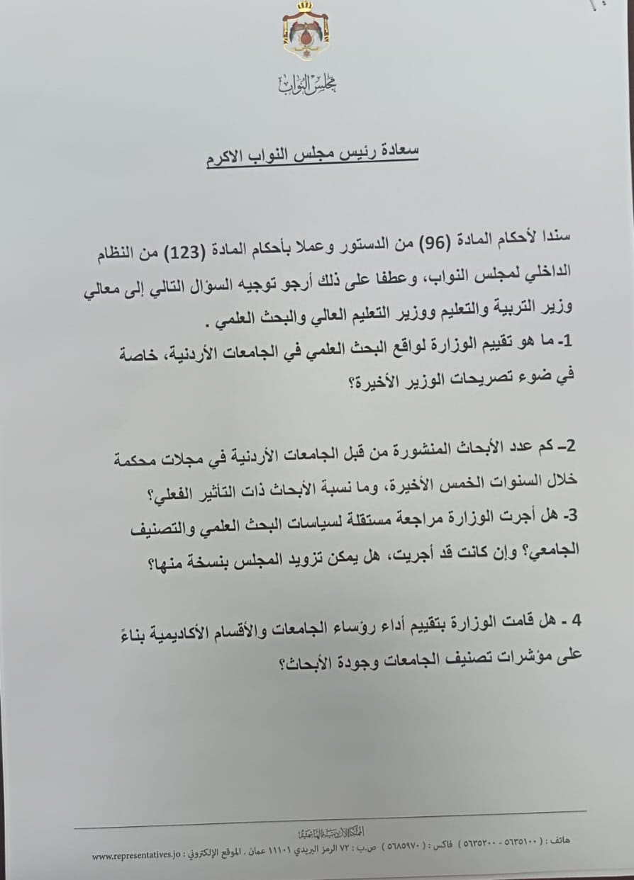 الوقائع الإخبارية: وجه رئيس كتلة عزم النيابية النائب أيمن أبو هنية عددا من الأسئلة النيابية إلى وزير التربية والتعليم ووزير التعليم العالي والبحث العلمي استنادا لأحكام المادة"96" من الدستور الأردني حول تصريحات الوزير الاخيرة منها هل ترى الوزرة تصريحات الوزير الاخيرة حول الأبحاث وصحة تصنيفات الجامعات تخدم صورة الأردن التعليمية وأن لم تكن دقيقة فهل سيكون هناك إصدار توضيح رسمي.