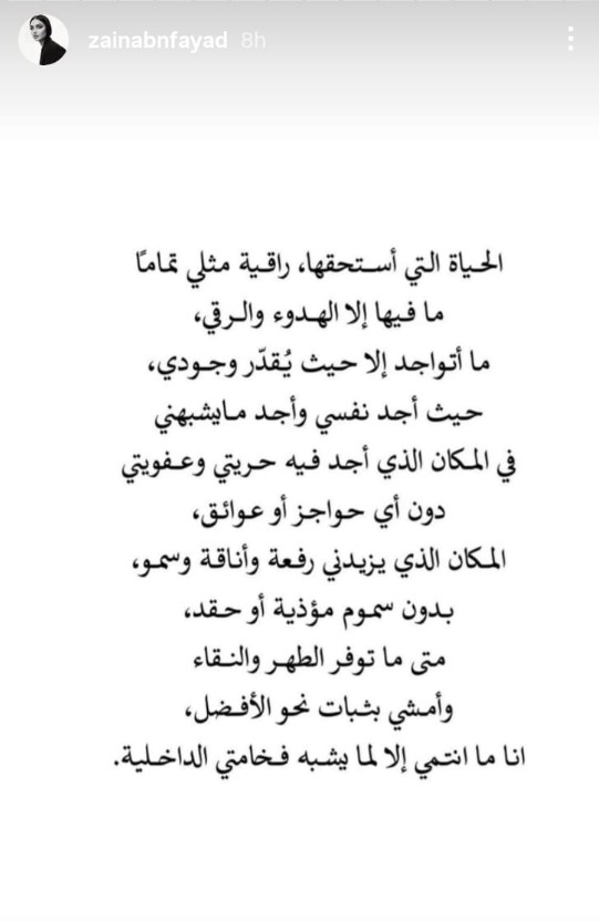 وقد نشرت قبل ساعات قليلة منشورا عبر خاصية "الستوري" أثارت فيه الجدل حيث كتبت: "الحياة التي أستحقها راقية مثلي تماما ما فيها إلا الهدوء والرقي، ما أتواجد إلا حيث أجد نفسي وأجد ما يشبهني في المكان الذي أجد فيه حريتي وعفويتي دون أي حواجز أو عوائق، المكان الذي يزيدني رفعة وأناقة وسمو، بدون سموم مؤذية أو حقد، متى ما توفر الطهر والنقاء وأمشي بثبات نحو الأفضل، انا ما انتمي إلا لما يشبه فخامتي الداخلية. "