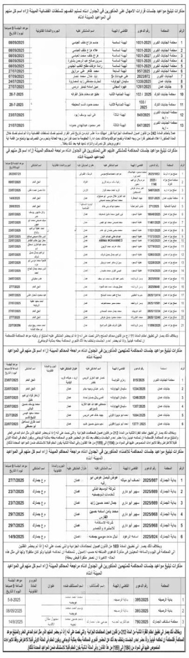 الوقائع الإخبارية: صدرت الاثنين 21/7/2025 مذكرات تبليغ مواعيد جلسات المحاكمة لمشتكى عليهم ولمتهمين ولأظناء وقرارات إمهال.