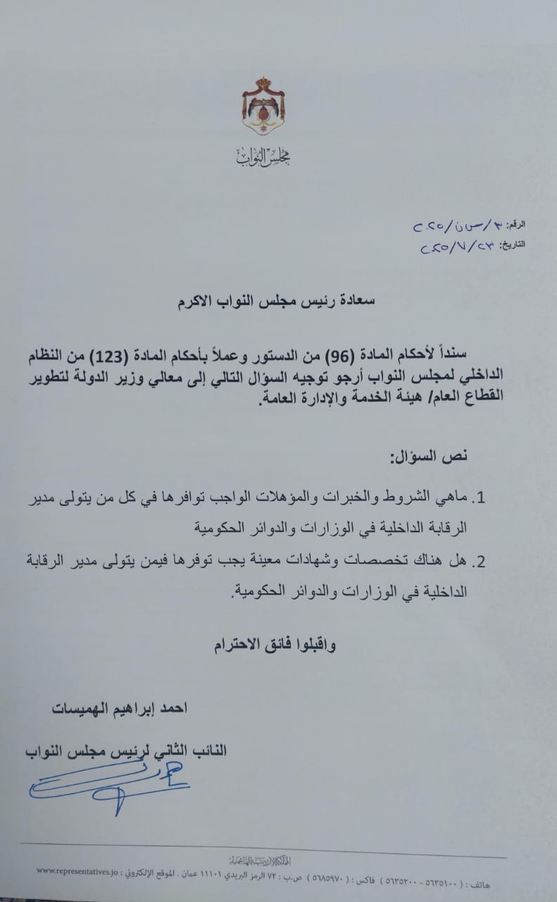 الهميسات يوجه سؤالاً حول شروط تولي مدراء الرقابة الداخلية في الوزارات والدوائر الحكومية