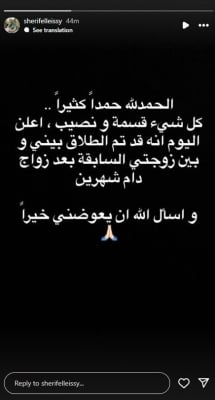 ونشر الليثي الابن عبر حسابه على "إنستغرام" بياناً قصيراً عبر خاصية "استوري" قال فيه: "الحمدلله حمداً كثيراً.. كل شيء قسمة ونصيب، أعلن اليوم أنه قد تم الطلاق بيني وبين زوجتي السابقة بعد زواج دام شهرين.. وأسأل الله أن يعوضني خيراً".