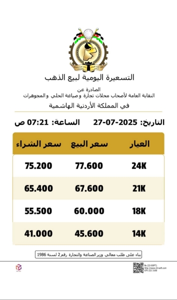 وحسب النشرة اليومية التي أصدرتها النقابة العامة لأصحاب محلات تجارة وصياغة الحلي والمجوهرات، بلغ سعر الغرام الواحد من الذهب عيارات 24 و18 و14 لغايات البيع من محلات الصاغة عند 77.6 و60 دينارا و45.6 دينارا على التوالي.