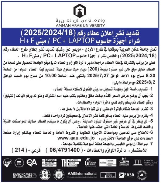 الوقائع الإخبارية:تعلن جامعة عمان العربية عن رغبتها بتمديد فترة العطاء رقم (18/2024/2025) والخاص بشراء أجهزة( PC + LAPTOP) للمبنى H + F