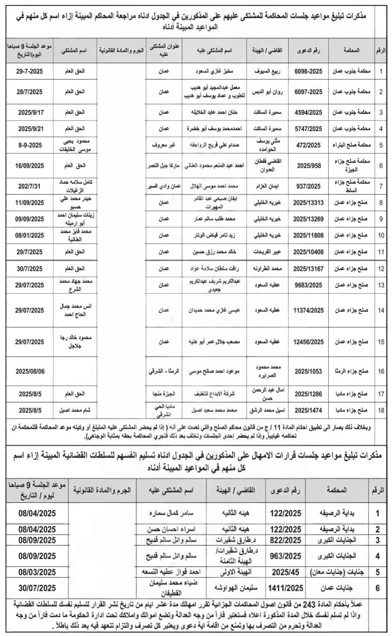الوقائع الإخبارية:صدرت الاثنين 28/7/2025 مذكرات تبليغ مواعيد جلسات المحاكمة لمشتكى عليهم ولمتهمين ولأظناء وقرارات إمهال.