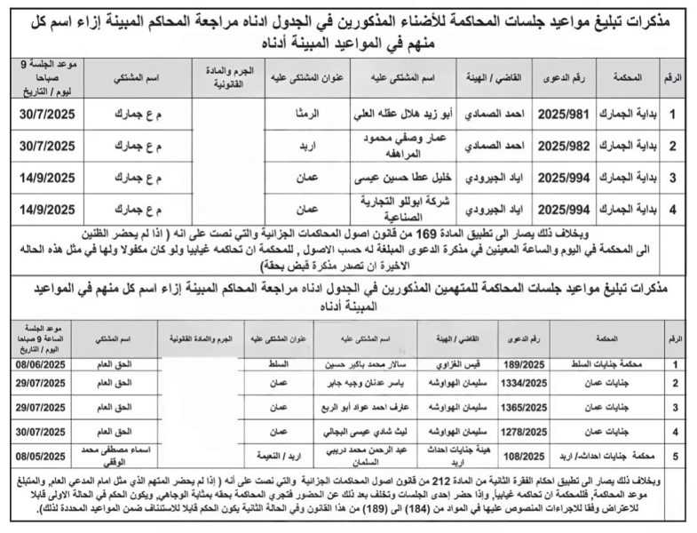 بالأسماء ... مذكرات تبليغ مواعيد جلسات محاكمة لأردنيين