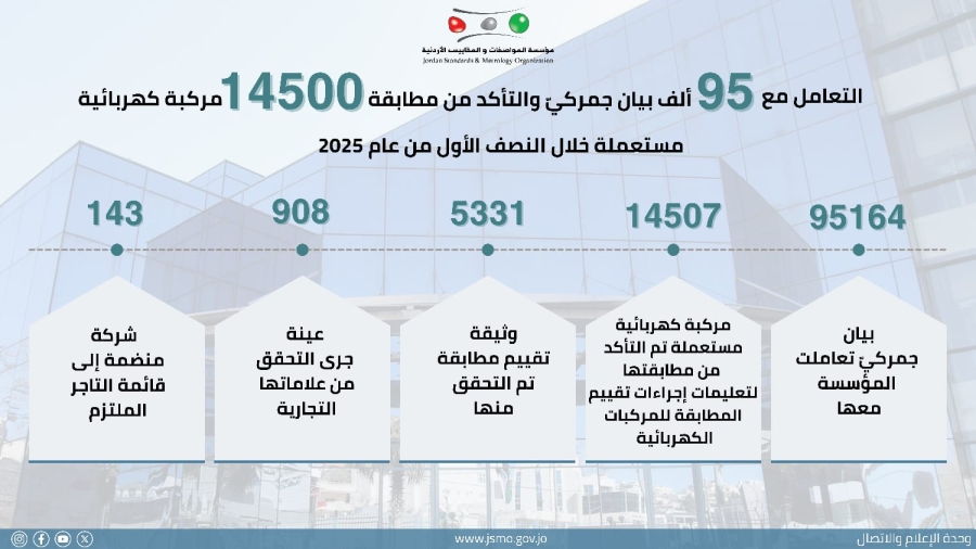الوقائع الإخبارية - تعاملت مؤسسة المواصفات والمقاييس، خلال النصف الأول من العام الحالي، مع 95164 بيانا جمركيا.