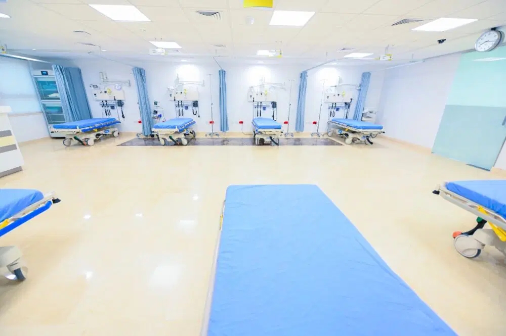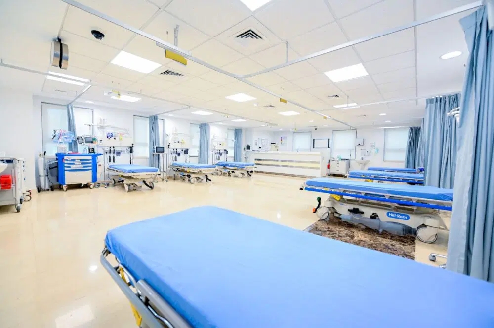 قسم الاسعاف والطوارئ تم انشاؤه وتزويده بجميع الأجهزة والأدوات والمعدات التي تمكن كافة الكوادر العاملة في القسم لإستقبال جميع حالات الحوادث والإصابات بالإضافة إلى جميع الحالات الطبية الإسعافية العاجلة في جميع التخصصات ، ووجود غرف خاصة مجهزة كغرفة تصنيف الحالات المرضية ، وغرفة العمليات الصغرى والكبرى، وغرفة الجبائر والجبس لعلاج حوادث السير والسقوط ، مع توفر جميع أنواع الجبائر والجبس حسب حاجة المريض والطبيب، وجناح طوارئ الأطفال والمجهز بكافة المعدات اللازمة ، وطوارئ النسائية التابعة لقسم النسائية وذلك لضمان خصوصية المريضة وراحتها، وغرف إنتظار واسعة للمرضى والتي تراعي معايير الوقاية والتباعد، وغرف طوارئ الأسنان وأسنان الأطفال لجميع الحالات الطارئة وغير الطارئة، وغرف العزل المنفصلة عن باقي الغرف والتي تعمل ضمن معايير ضبط العدوى والوقاية الشخصية .