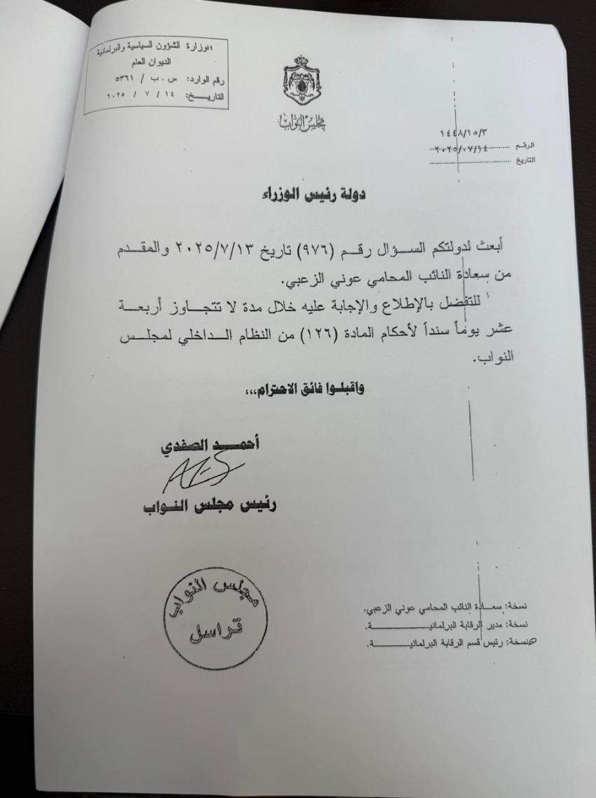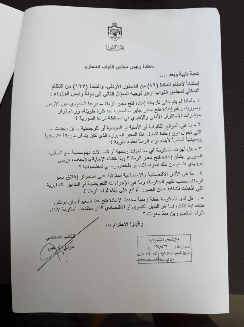 النائب الزعبي يتلقى ردًا رسميًا حول استمرار إغلاق معبر الرمثا