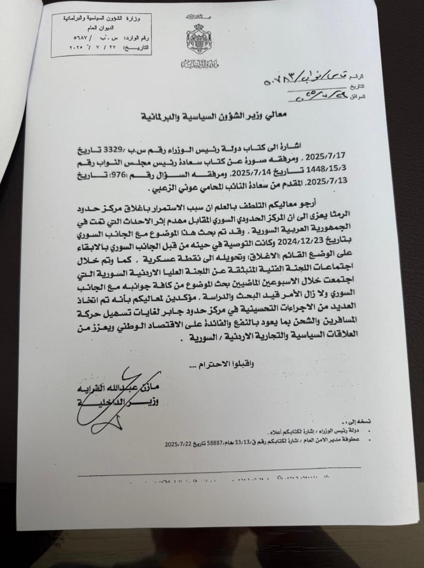 وقال الزعبي إنّه تلقى ردًا من وزير الداخلية، أوضح فيه أن استمرر اغلاق المعبر يعود لاعتبارات أمنية تتعلق بالوضع على الجانب السوري، وهناك تنسيق مستمر عبر اللجنة الامنية الأردنية السورية المشتركة، لبحث إمكانية اعادة فتح المعبر متى توفرت الظروف المناسبة.