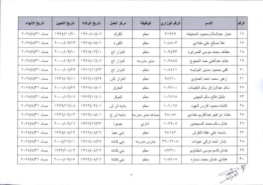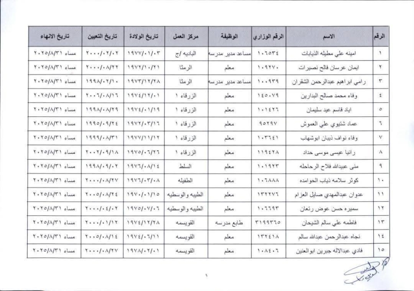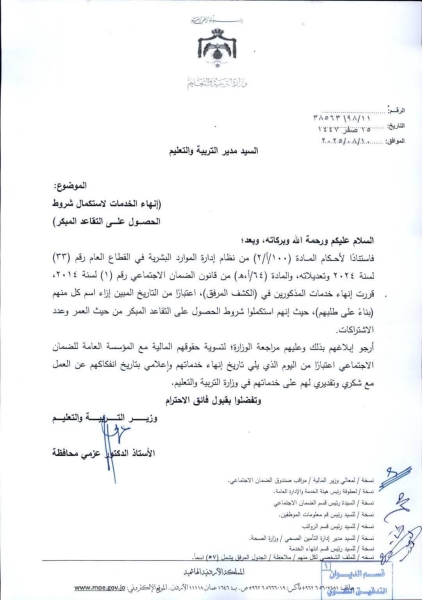 الوقائع الإخبارية:قرر وزير التربية والتعليم إنهاء خدمات عدد من الموظفين بناء على طلبهم حيث استكملوا شروط التقاعد المبكر.