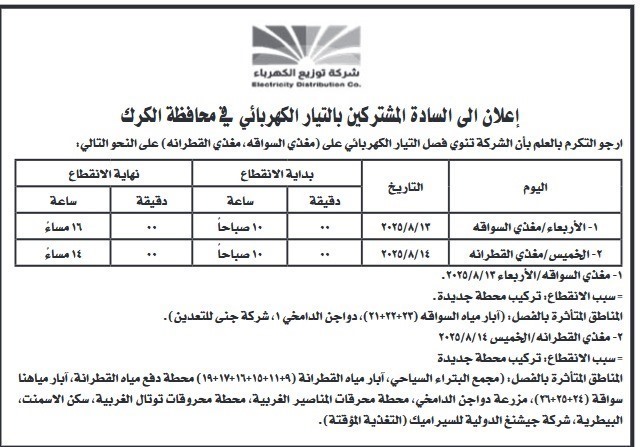 الوقائع الإخبارية: اعلنت شركة توزيع الكهرباء عن فصل التيار الكهربائي عن مناطق في الكرك على النحو التالي: