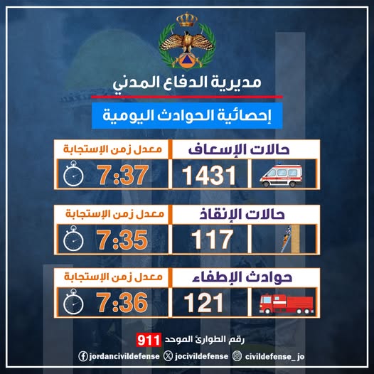 الوقائع الإخبارية: تعاملت كوادر مديرية الدفاع المدني خلال الـ 24 ساعة الماضية مع 1431 حالة إسعافية مختلفة، حيث بلغ معدل زمن الاستجابة لتلك الحالات نحو 7 دقائق و37 ثانية.
