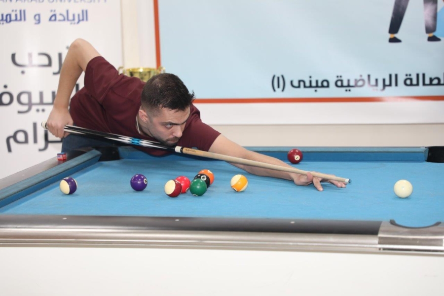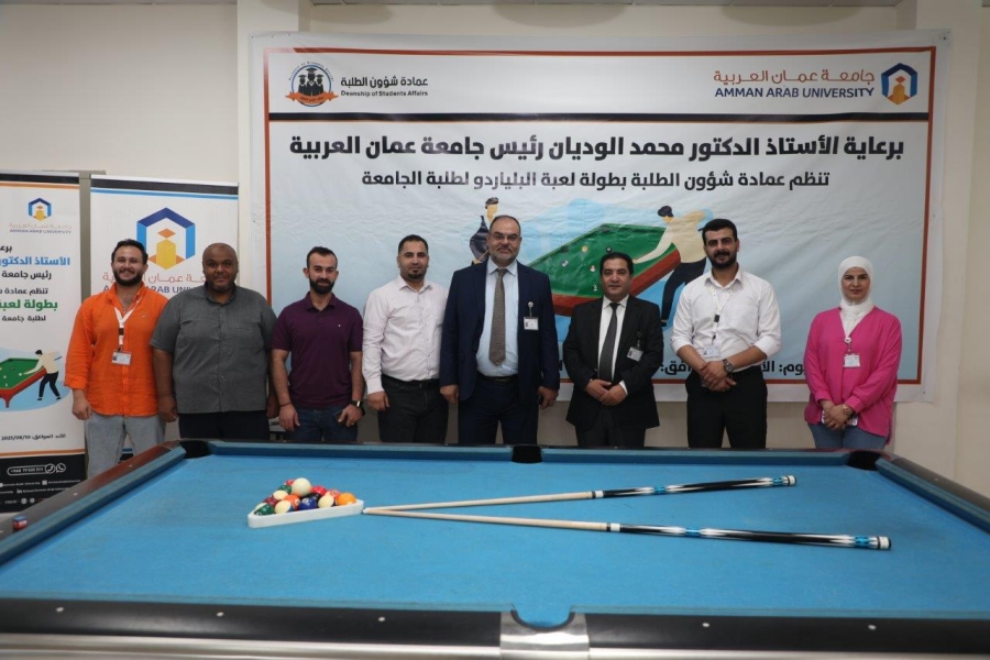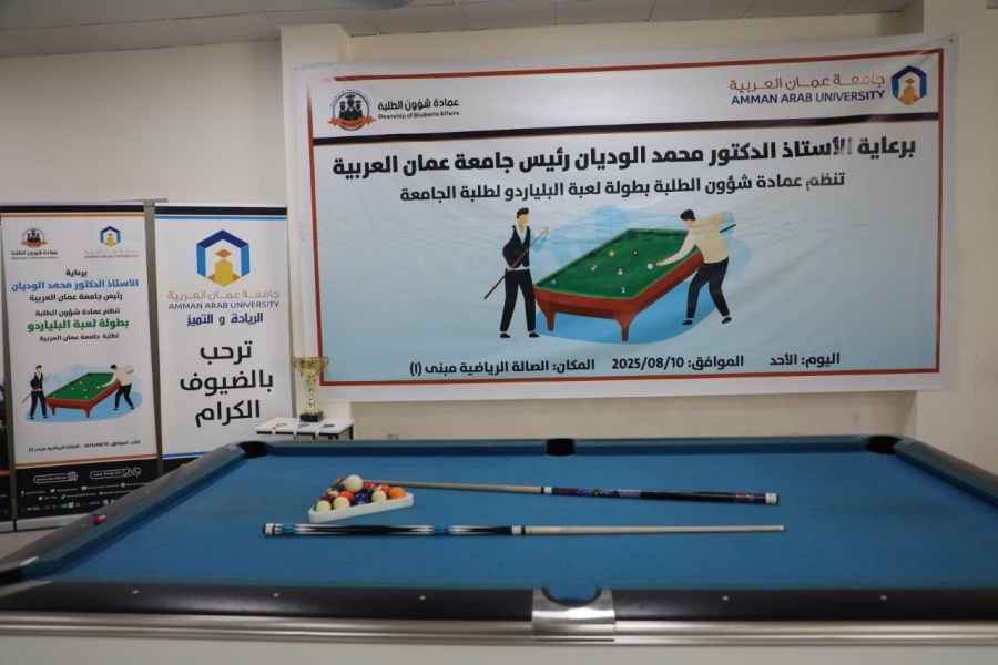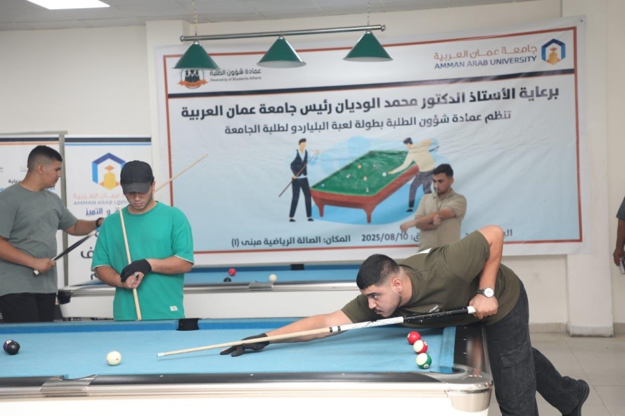 الوقائع الإخبارية:ضمن جهود جامعة عمان العربية في تعزيز الأنشطة اللامنهجية وتنمية مهارات الطلبة وتحت رعاية الأستاذ الدكتور محمد الوديان رئيس جامعة عمان العربية، نظمت عمادة شؤون الطلبة / قسم الأنشطة الطلابية في الجامعة بطولة البلياردو لطلبة الجامعة وبمشاركة (30) طالباً من مختلف تخصصات الجامعة، وافتتح البطولة الأستاذ الدكتور إسماعيل يامين مساعد الرئيس للشؤون الاكاديمية مندوباً عن رئيس الجامعة حيث أعرب عن تمنياته للمشاركين بالتوفيق والنجاح، ومشددًا على أهمية المنافسة بروح رياضية تعكس قيم التعاون والاحترام بين الطلبة.