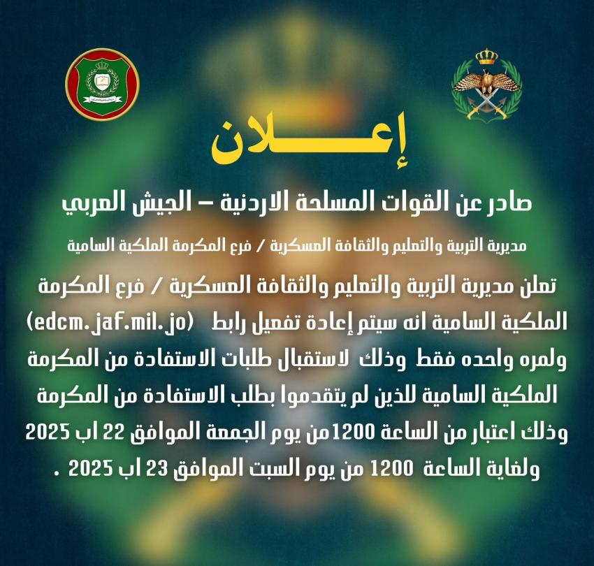 الوقائع الإخبارية : أعلنت مديرية التربية والتعليم والثقافة العسكرية – فرع المكرمة الملكية السامية، عن إعادة تفعيل الرابط الإلكتروني: edcm.jaf.mil.jo ، ولمرة واحدة فقط، لاستقبال طلبات الاستفادة من المكرمة الملكية السامية للطلبة الذين لم يتقدموا بطلباتهم مسبقاً.