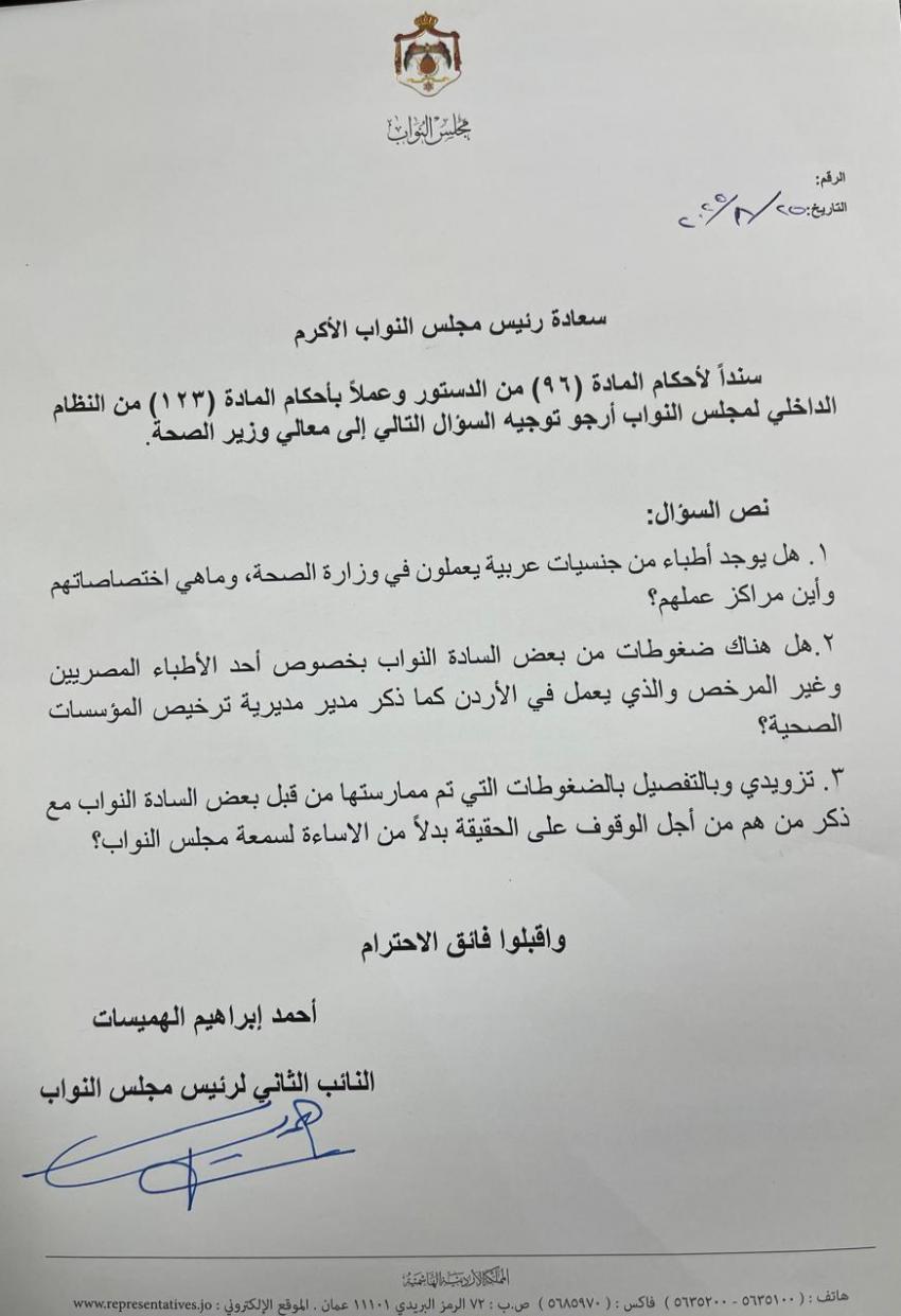 الوقائع: وجّه النائب الثاني لرئيس مجلس النواب أحمد إبراهيم الهميسات سؤالاً نيابياً إلى وزير الصحة، استناداً لأحكام المادة (96) من الدستور وأحكام المادة (123) من النظام الداخلي لمجلس النواب، طالب فيه بالكشف عن وجود أطباء من جنسيات عربية يعملون في وزارة الصحة، وبيان أماكن عملهم واختصاصاتهم.