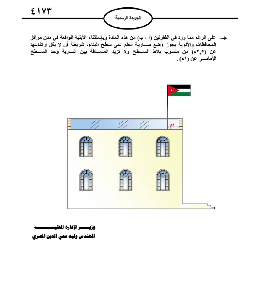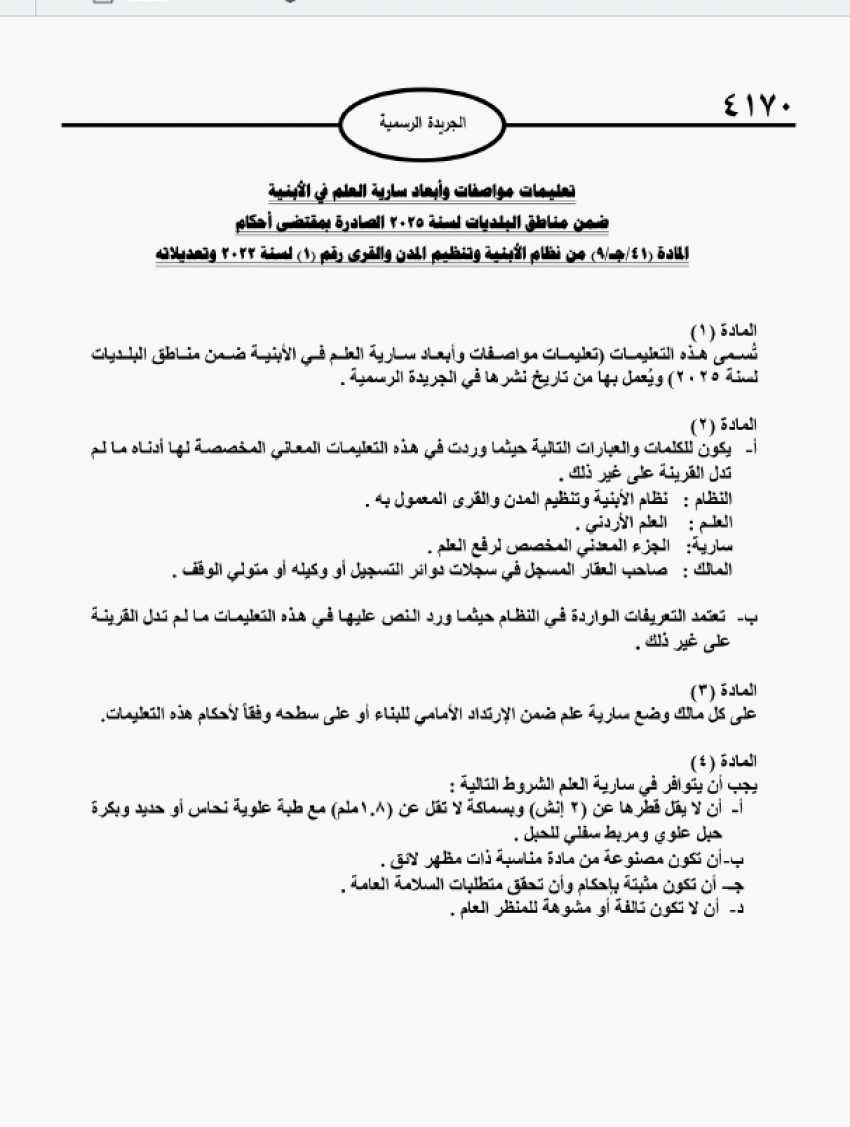 الوقائع : صدرت في عدد الجريدة الرسمية اليوم السبت، تعليمات مواصفات وأبعاد سارية العلم في الأبنية ضمن مناطق البلديات لسنة 2025 الصادرة بمقتضى أحكام