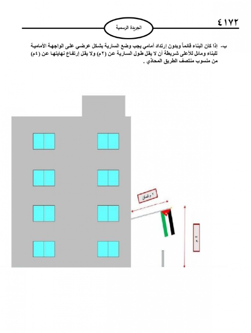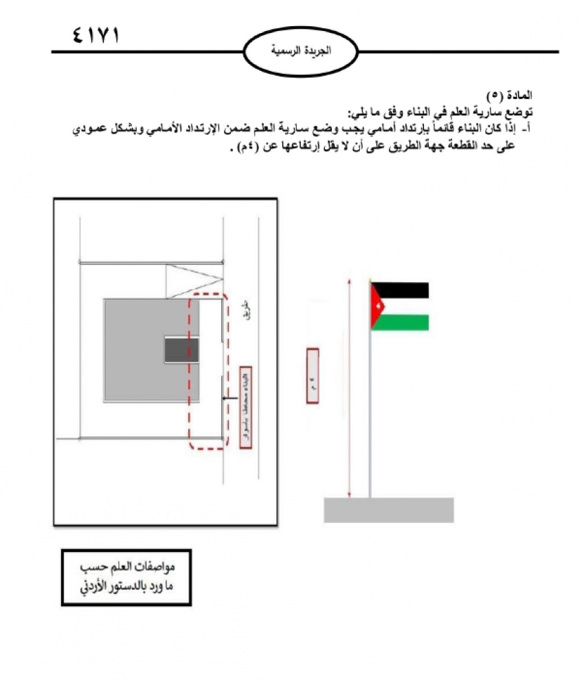واشترطت التعليمات على كل مالك وضع سارية علم ضمن الإرتداد الأمامي للبناء أو على سطحه.