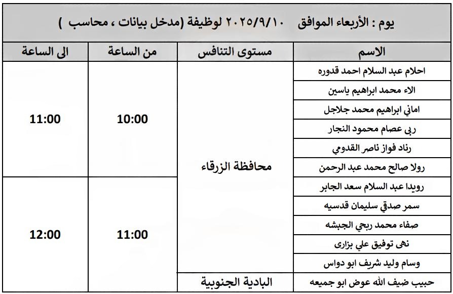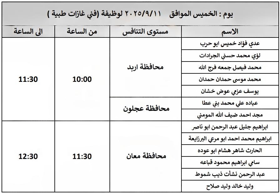 الوقائع :دعت وزارة الصحة المرشحين المبينة أسماؤهم بالملف ادناه والذين اجتازوا الامتحان التنافسي بنجاح التواجد في مديرية الموارد البشرية / الطابق التاسع في مبنى الوزارة الكائن في طبربور قرب مستشفى الامير حمزة في الموعد المحدد لاجراء المقابلة الشخصية، مع مراعاة ما يلي:
