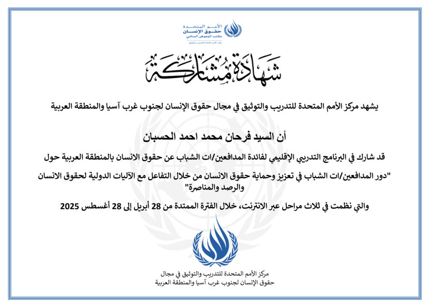 حيث تهدف هذه الدورات التدريبية الى تعزيز قدرات المدافعين الشباب في مجال التفاعل مع الآليات الدولية لحقوق الانسان والرصد والمناصرة، بالإضافة الى تعزيز قدرة المدافعين الشباب عن حقوق الإنسان في المنطقة العربية للتفاعل مع هيئات وآليات حقوق الإنسان التابعة للأمم المتحدة، حيث ركز البرنامج، الذي امتد من أبريل إلى أغسطس 2025، على تأهيل المشاركين في ثلاث مراحل أساسية، حيث هدفت المرحلة الأولى على تعزيز التفاعل مع آليات الأمم المتحدة وتمكين المشاركين من التفاعل بفعالية مع هيئات وآليات الأمم المتحدة المعنية بحقوق الإنسان، وشملت هذه الآليات اللجان المتخصصة والمقررين الخاصين الذين يعملون على رصد أوضاع حقوق الإنسان في مختلف الدول، بهدف تزويد المشاركين بالمعرفة اللازمة لإيصال أصواتهم والمشاركة في جهود التغيير.