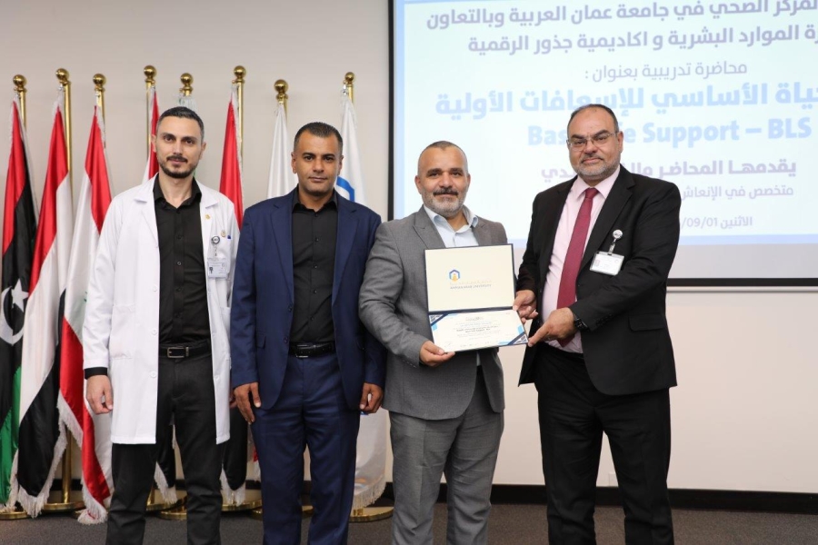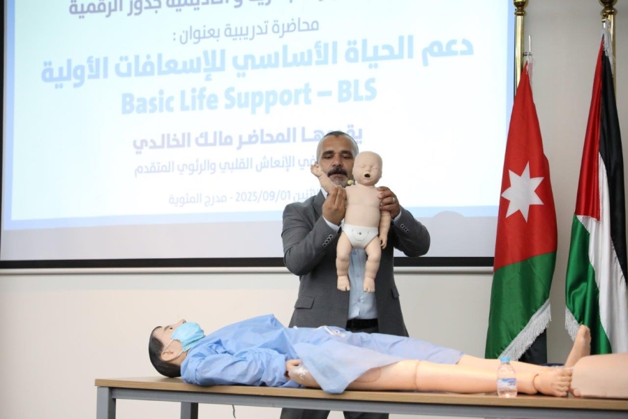 الوقائع: نظم المركز الصحي بالشراكة مع دائرة الموارد البشرية في جامعة عمان العربية وبالتعاون مع أكاديمية جذور الرقمية، محاضرة تدريبية بعنوان""دعم الحياة الأساسي للإسعافات الأولية – Basic Life Support (BLS)"، قدمها الأستاذ مالك الخالدي المتخصص في الإنعاش القلبي الرئوي، ومدير المركز التدريبي في نقابة الممرضين وعضو اللجنة الوطنية لتطوير المهن في المجلس الصحي العالي، وبحضور الأستاذ الدكتور إسماعيل يامين مساعد الرئيس للشؤون الأكاديمية مندوباً عن الأستاذ الدكتور محمد الوديان رئيس جامعة عمان العربية، والأستاذ محمد البستنجي ممثلاً عن أكاديمية جذور الرقمية وعدد من أعضاء الهيئتين التدريسية والإدارية والطلبة في الجامعة.