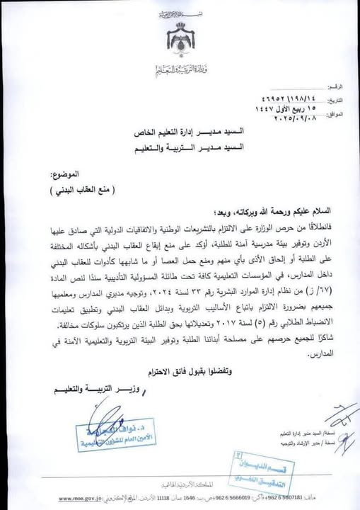 الوقائع: أصدرت وزارة التربية والتعليم تعميمًا يؤكد منع جميع أشكال الضرب أو استخدام العصا داخل المدارس الحكومية والخاصة ومنع حمل العصا او ما يشابهها تحت طائلة المسؤولية التأديبية، مشددة على أن أي إيذاء بدني للطلبة يتعارض مع التشريعات الوطنية والاتفاقيات الدولية.