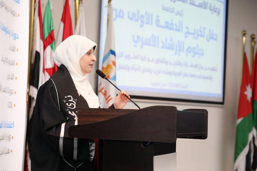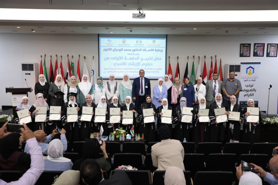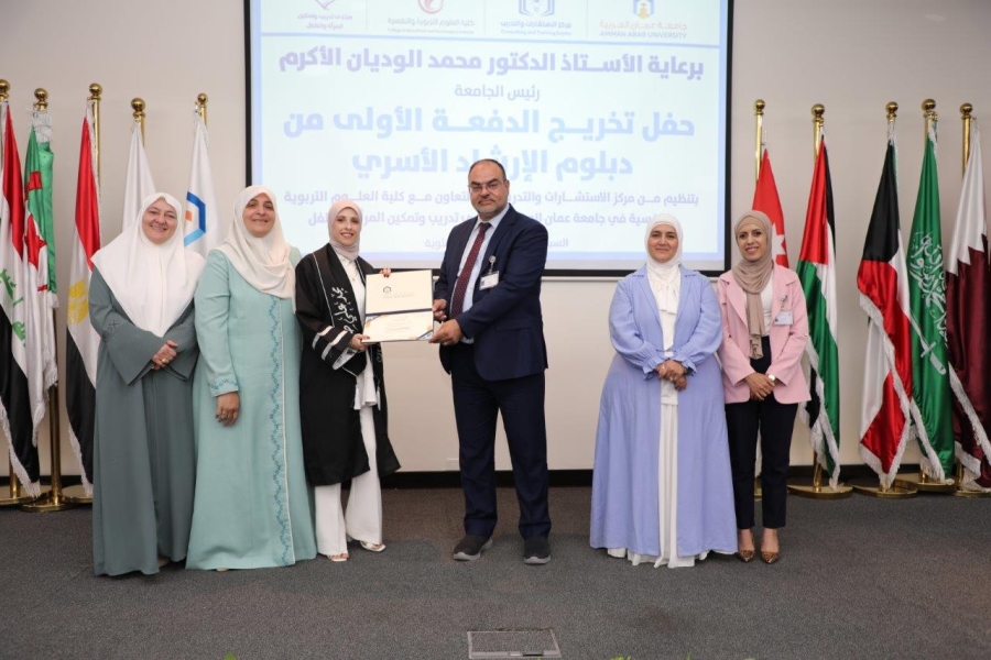 الوقائع :برعاية رئيس جامعة عمان العربية الأستاذ الدكتور محمد الوديان، وانسجامًا مع فلسفة الجامعة القائمة على مدّ جسور الشراكة مع مؤسسات المجتمع المدني، وخدمة القضايا الكبرى التي تمس حياة كل أسرة أردنية، نظم مركز الاستشارات والتدريب بالتعاون مع كلية العلوم التربوية والنفسية في الجامعة ومنتدى تدريب وتمكين المرأة والطفل حفل تخريج الفوج الأول من طلبة الدبلوم التدريبي "الارشاد الأسري التربوي"، وذلك بحضور الأستاذ الدكتور إسماعيل يامين مساعد الرئيس للشؤون الأكاديمية مندوباً عن رئيس الجامعة.