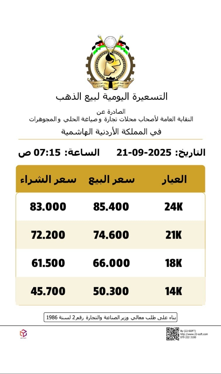 الوقائع :أعلنت النقابة العامة لأصحاب محلات تجارة وصياغة الحلي والمجوهرات، الأحد، أن سعر بيع غرام الذهب عيار 21 بلغ 74.60 ديناراً لغايات البيع من محلات الصاغة، مقابل 72.20 ديناراً للشراء.