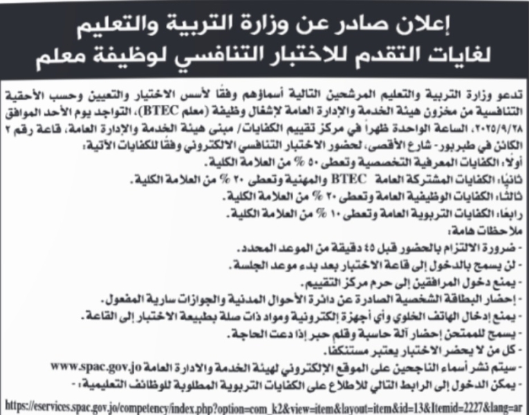 الوقائع : دعت وزارة التربية والتعليم، اليوم الاثنين، وفقًا لأسس الإستقطاب والترشيح من مخزون طلبات التوظيف في هيئة الخدمة والإدارة العامة لعام 2025 لغايات التعيين لإشغال وظيفة (معلم) التالية أسماؤهم لحضور الاختبار التنافسي.