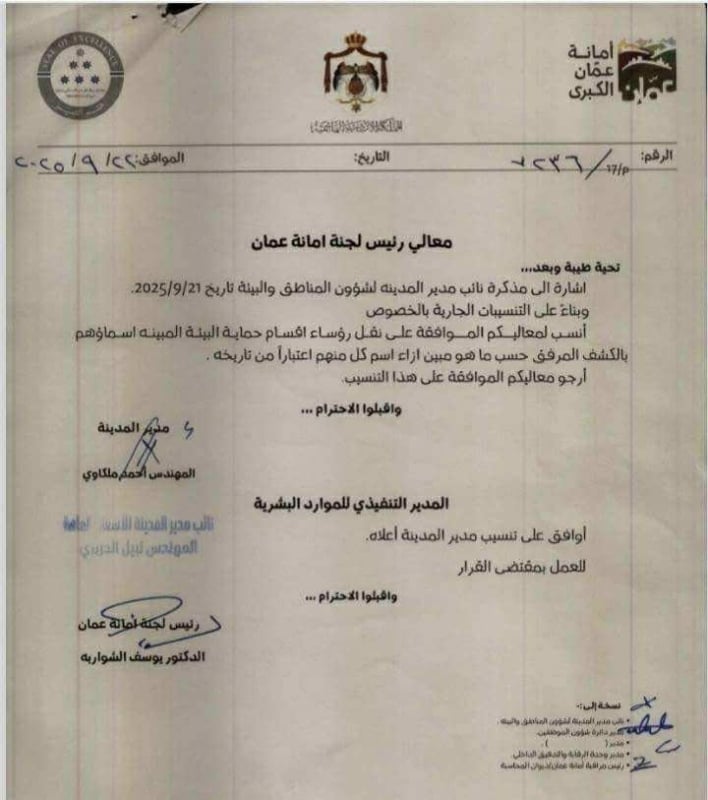 الوقائع : قررت أمانة عمّان الكبرى إجراء تنقلات بين مسؤولي البيئة في مختلف مناطقها، وذلك وفقاً للجدول المرفق أدناه.