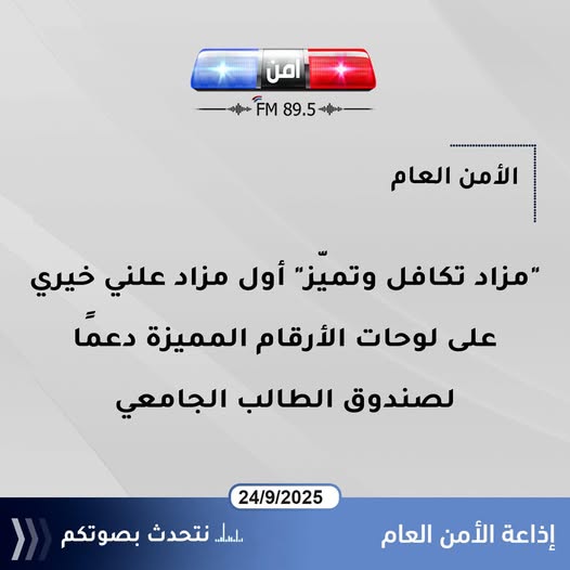 الأمن العام : "مزاد تكافل وتميّز" أول مزاد علني خيري على لوحات الأرقام المميزة دعماً لصندوق الطالب الجامعي