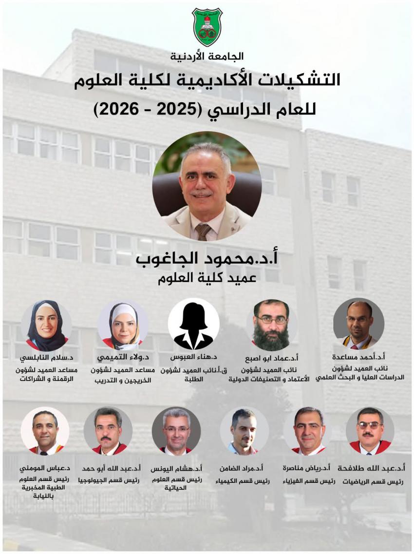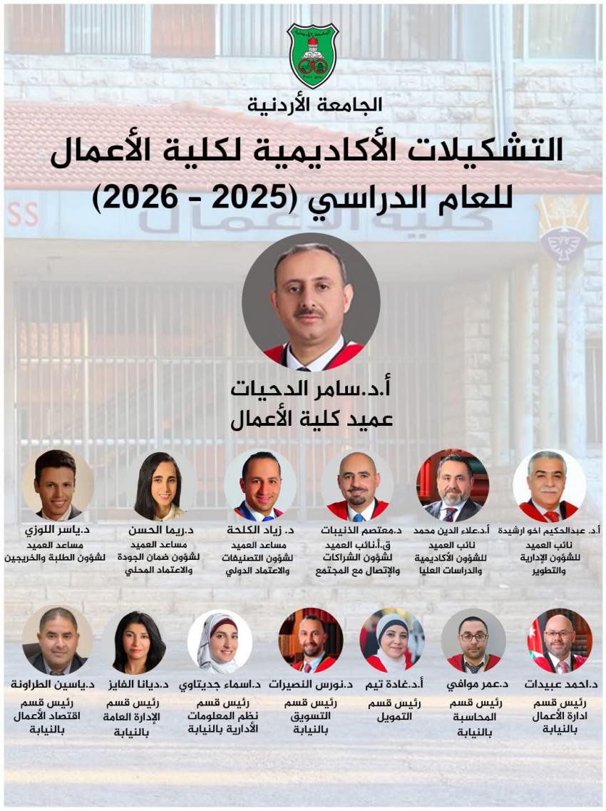الوقائع: قرر رئيس الجامعة الأردنيّة الدكتور نذير عبيدات، بناءً على تنسيب الأساتذة العمداء، الموافقة على إجراء التشكيلات الإدارية والاكاديمية.