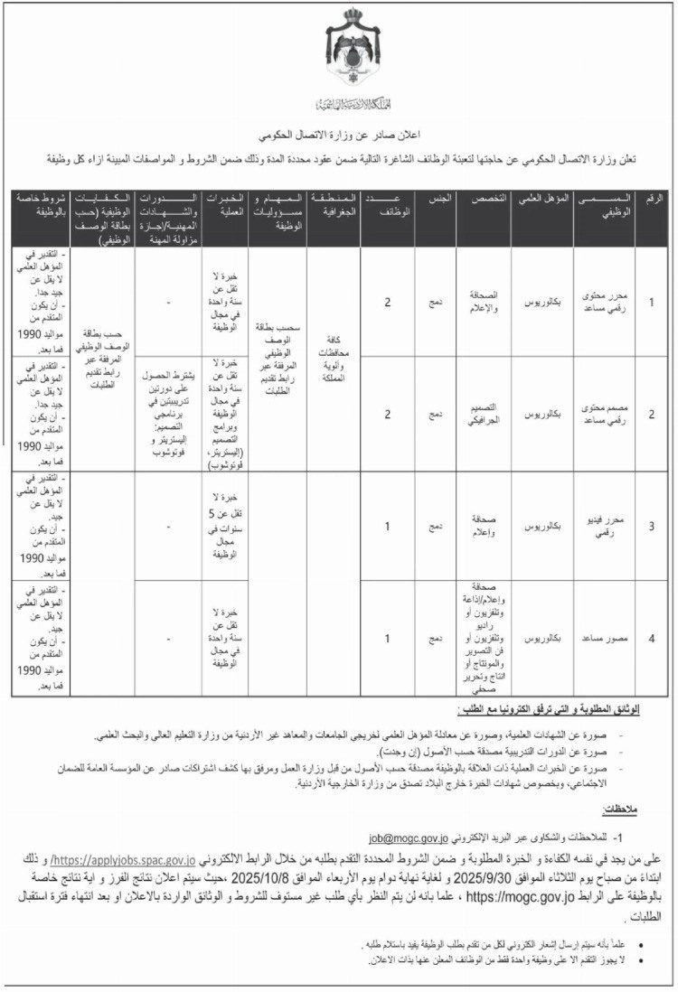 الوقائع :-أعلنت وزارة الاتصال الحكومي، اليوم الاثنين، عن حاجتها لتعبئة الوظائف الشاغرة التالية ضمن عقود محددة المدة، وذلك ضمن الشروط والمواصفات المبينة إزاء كل وظيفة.