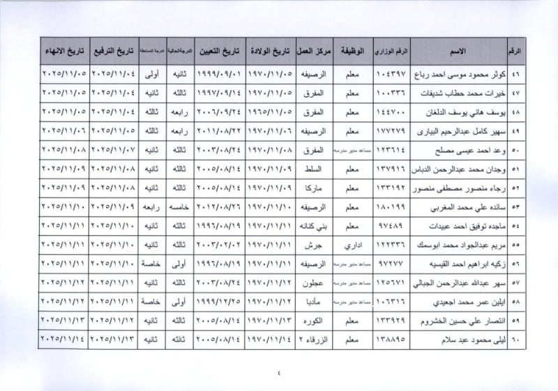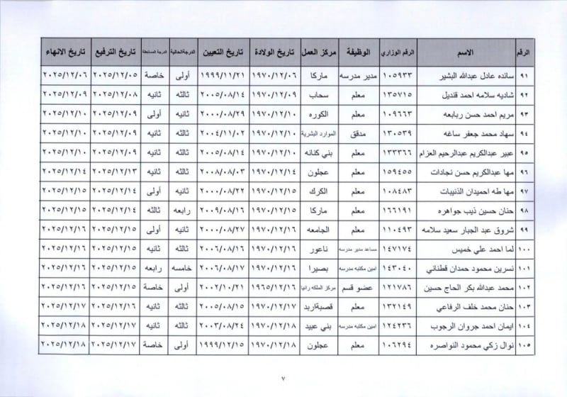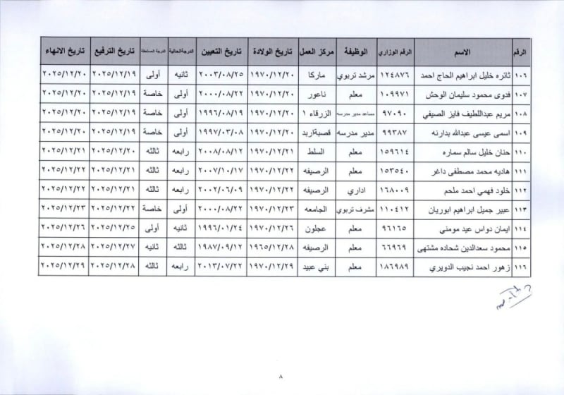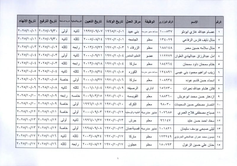 الوقائع :قرر وزير التربية والتعليم إنهاء خدمات المذكورين في الكشف المرفق لبلوغهم السن القانونية، اعتبارا من التاريخ المبين إزاء اسم كل منهم وترفيعهم وجوبيًا من الدرجة الحالية إلى الدرجة الأعلى قبل تاريخ إنهاء خدماتهم.