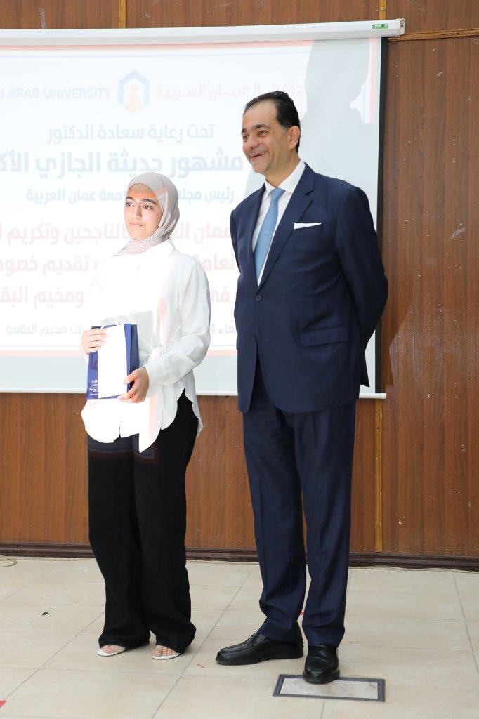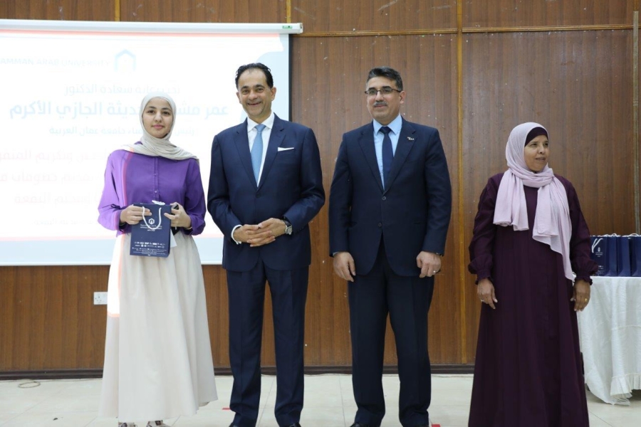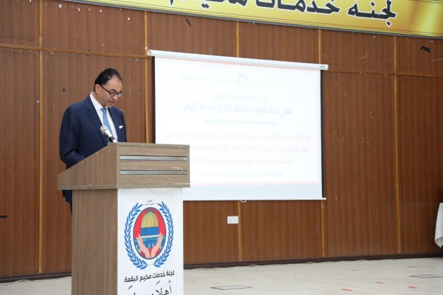 الوقائع :تعزيزاً لجسور التعاون مع المجتمع المحلي وبرعاية رئيس مجلس أمناء جامعة عمان العربية الدكتور عمر مشهور حديثه الجازي، نظمت جامعة عمان العربية احتفالاً لتكريم الطلبة المتفوقين بالثانوية العامة في لواء عين الباشا ومخيم البقعة بحضور الأستاذ الدكتور حسام الحمد نائب الرئيس للتخطيط وضمان الجودة مندوباً عن الأستاذ الدكتور محمد الوديان رئيس الجامعة، وعدد من عمداء الكليات ومدراء الوحدات الإدارية وعدد من وجهاء المنطقة وحشد من أهالي الطلبة وذويهم، وبتنسيق من الدكتورة باسمة أبو جابر من مكتب التربية العملية والابداع وخدمة المجتمع في جامعة عمان العربية.