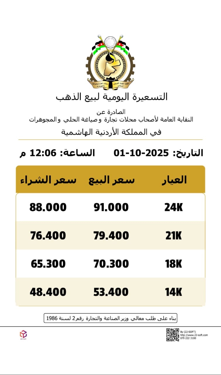 وبحسب التسعيرة الثانية الصادرة عن النقابة العامة لأصحاب محالّ تجارة وصياغة الحلي والمجوهرات، ارتفعت أسعار الذهب، ليصل سعر بيع غرام الذهب عيار 21 –الأكثر طلبًا من قبل المواطنين– إلى 79.40 دينارًا لغايات البيع من محالّ الصاغة، مقابل 76.40 دينارًا لغايات الشراء.