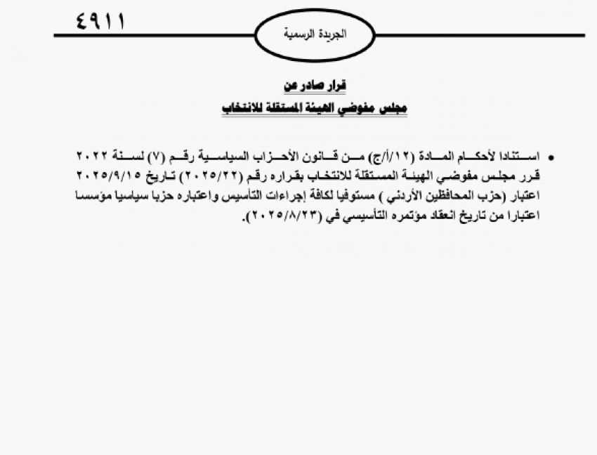 الوقائع: صدر في عدد الجريدة الرسمية اليوم الأربعاء، قرار مجلس مفوضي الهيئة المستقلة للانتخاب باعتبار حزب المحافظين الأردنين مستوفيًا لإجراءات التأسيس كافة واعتباره حزبًا سياسيًا مؤسسًا اعتبارًا من تاريخ انعقاد مؤتمره التأسيسي في 23 آب 2025.