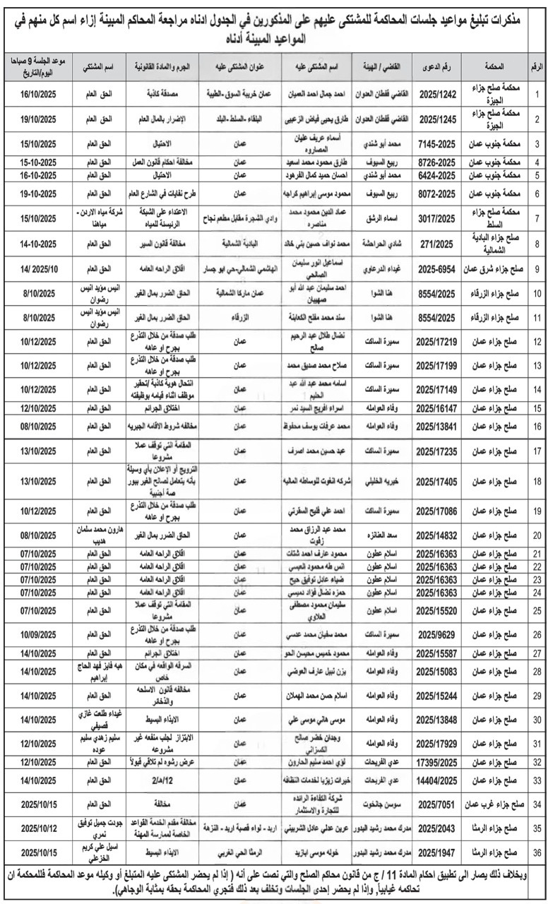 بالأسماء ... مذكرات تبليغ مواعيد جلسات محاكمة لأردنيين