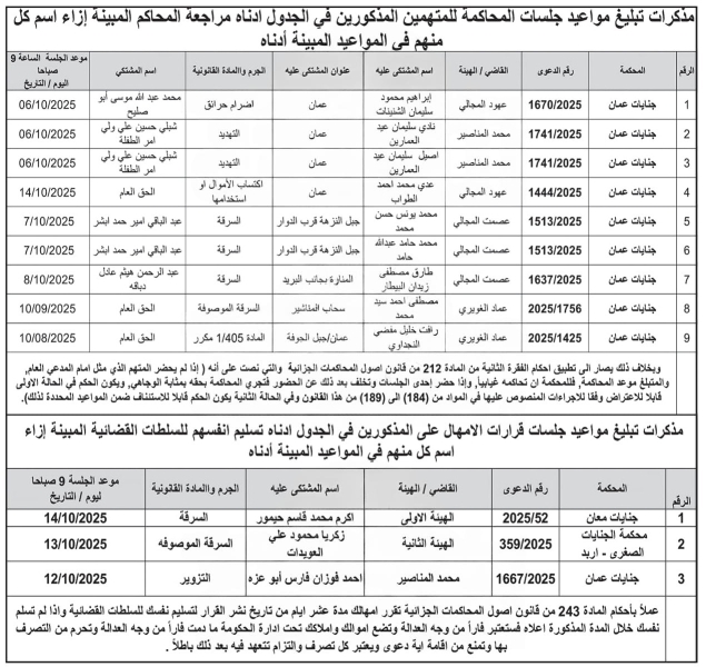 الوقائع: صدرت يوم الاثنين 6 تشرين الأول 2025 مذكرات تبليغ لمواعيد جلسات محاكمة بحق عدد من المشتكى عليهم والمتهمين والأظناء، إضافة إلى قرارات إمهال نشرت في الصحف اليومية.