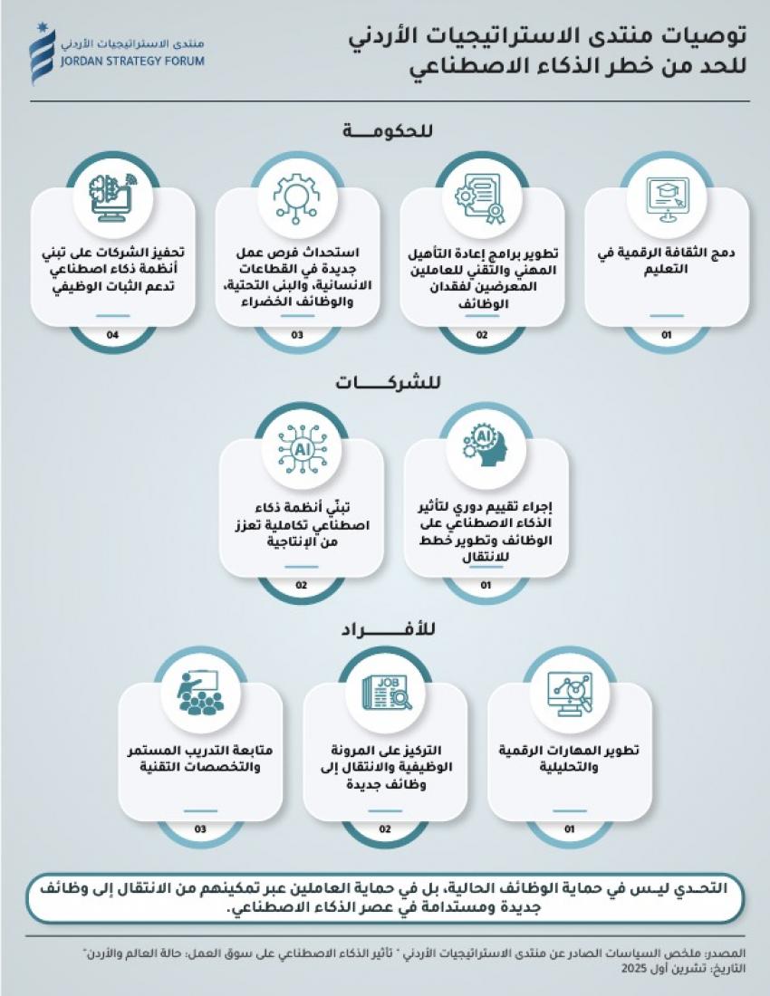 وفي الختام ذكر المنتدى، بأن التحدي أمام الأردن يكمن في التركيز على نوعية التعليم، وإعادة تأهيل المهارات، واستحداث فرص عمل جديدة ضمن قطاعات مستهدفة، وتبني تشريعات ذكية تنظم استخدامات الذكاء الاصطناعي، بالإضافة إلى تعزيز شبكة الحماية الاجتماعية. أي بعبارة أخرى، لا يكمن التحدي في حماية الوظائف الحالية، بل في حماية العاملين فيها بتمكينهم من الانتقال بسلاسة إلى وظائف جديدة ومستدامة.