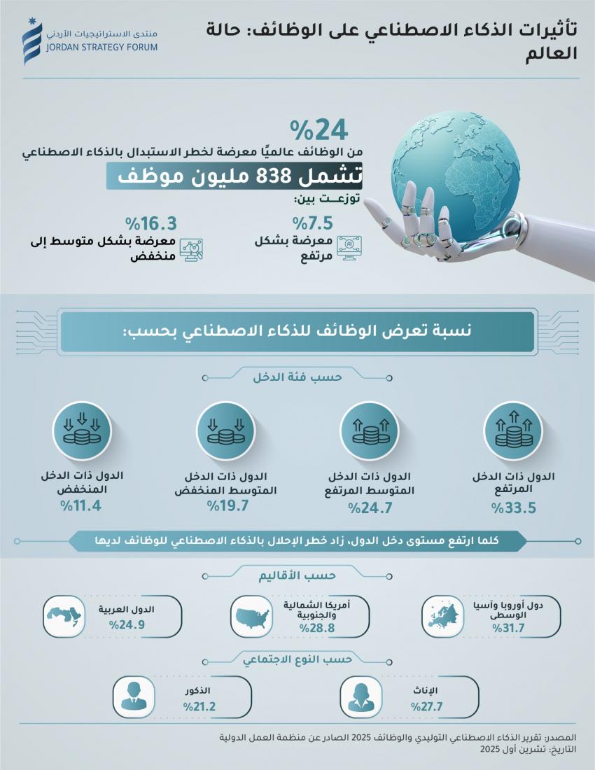 الوقائع: أصدر منتدى الاستراتيجيات الأردني ملخص سياسات بعنوان "تأثير الذكاء الاصطناعي على سوق العمل: حالة العالم والأردن" وذلك لتسليط الضوء على أبرز نتائج تقرير "الذكاء الاصطناعي التوليدي والوظائف: مؤشر عالمي محسّن للتعرّض المهني 2025" الصادر عن منظمة العمل الدولية.