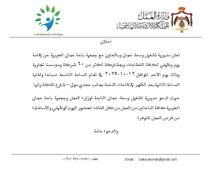 الوقائع : تعلن مديرية تشغيل وسط عمان وبالتعاون مع جمعية باحة عمان الخيرية عن إقامة يوم وظيفي لكافة القطاعات وبمشاركة أكثر من 60 شركة ومؤسسة تجارية وذلك يوم الاحد الموافق 12-10-2025 في تمام الساعة التاسعة صباحا ولغاية الساعة الثانية بعد الظهر في قاعات النخبة بجانب مجدي مول – شارع الملكة رانيا