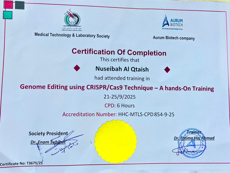 الوقائع: في إطار التزام جامعة عمان العربية المتواصل بدعم البحث العلمي والابتكار ، اجتازت الدكتورة نسيبة القطيش من كلية الصيدلة في جامعة عمان العربية برنامجاً تدريبياً متقدماً بعنوان: "CRISPR/Cas9 Genome Editing "، الذي نظمته مؤسسة AURUM BIOTECH بواقع (30) ساعة تدريبية شملت الجوانب النظرية والتطبيقية والبرمجية ، والذي استمر لمدة خمسة أيام تدريبية مكثفة تناولت مقدمة شاملة حول تقنية CRISPR/Cas9 وآفاقها العلمية، والتصميم الحاسوبي للبُنى الجينية، إلى جانب تطبيقات عملية في المختبر تضمنت تحضير العينات وفحصها واستخلاص البلازميد، وصولاً إلى التحقق من النتائج من خلال تقنيات التسلسل الجيني الحديثة.