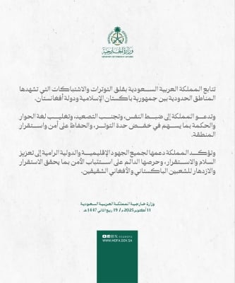 الوقائع : أصدرت الخارجية السعودية بيانا قالت فيه غنها تتابع بقلق التوترات والاشتباكات التي تشهدها المناطق الحدودية بين جمهورية باكستان الإسلامية ودولة أفغانستان.