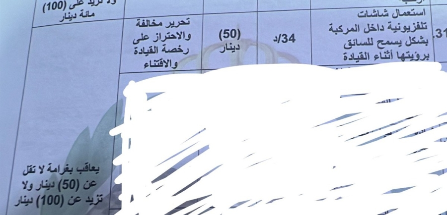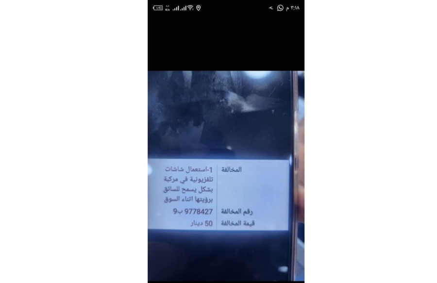 الوقائع: تناقل ناشطون على مواقع التواصل الاجتماعي صورة تُظهر مخالفة مرورية بقيمة 50 ديناراً تحت بند "استعمال السائق لشاشة تلفزيونية في المركبة بطريقة تمكنه من رؤيتها أثناء القيادة".