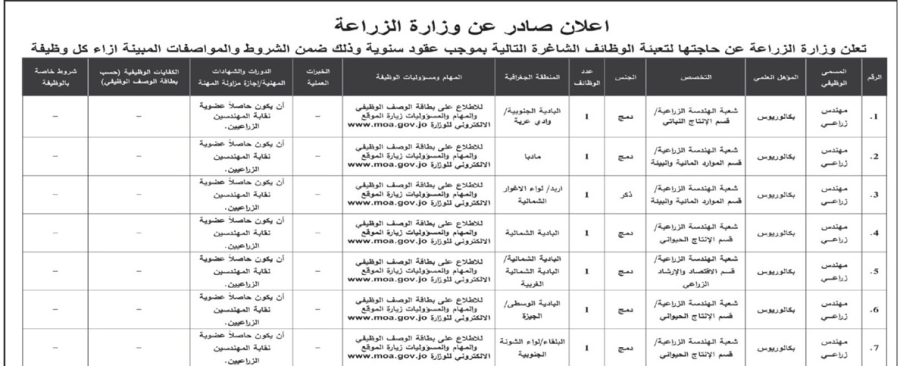 الوقائع : أعلنت وزارة الزراعة اليوم الخميس عن حاجتها لتعبئة وظائف شاغرة بموجب عقود سنوية .