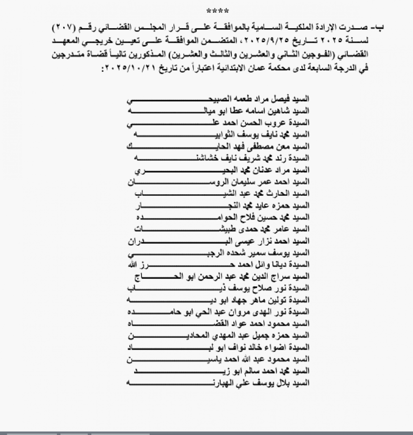 الوقائع: - صدرت في الجريدة الرسمية اليوم الخميس، إرادة ملكية سامية بالموافقة على تعيين قضاة من خريجي المعهد القضائي الفوجين الثاني والعشرين والثالث العشرين، قضاة متدرجين في الدرجة السابعة لدى محكمة عمان الابتدائية اعتباراً من تاريخ 21/10/2025.