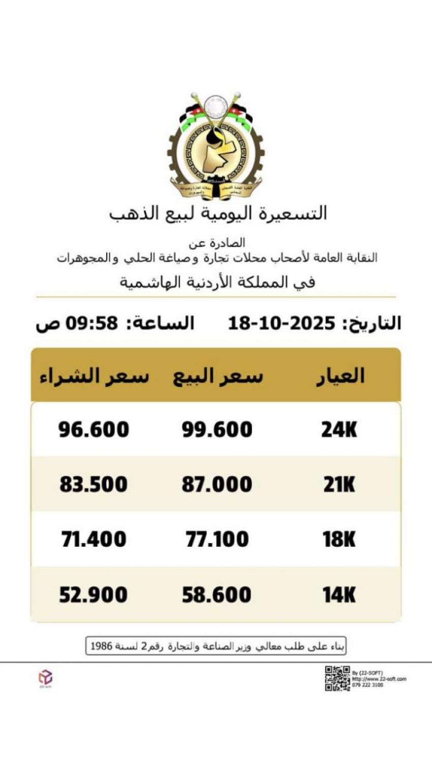 كما تراجع سعر غرام الذهب عيار 24 إلى 99.60 ديناراً، وعيار 18 إلى 77.10 ديناراً، فيما وصل سعر عيار 14 إلى 58.60 ديناراً للغرام الواحد، وذلك لغايات البيع لدى محلات الصياغة.