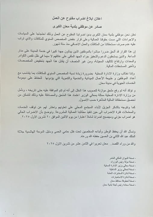 الوقائع الإخبارية: : أعلن موظفو بلدية معان الكبرى بدء إضراب مفتوح عن العمل احتجاجًا على السياسات والإجراءات التي تمس حقوقهم المالية، وعلى قرار خفض المخصص السنوي للمكافآت، مؤكدين أن القرار أدى إلى حرمانهم من مستحقات متفق عليها سابقًا تشمل المكافآت والعمل الإضافي.