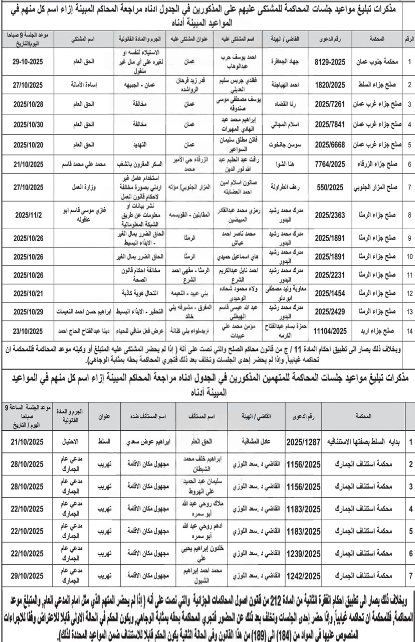 بالأسماء ... مذكرات تبليغ مواعيد جلسات محاكمة لأردنيين