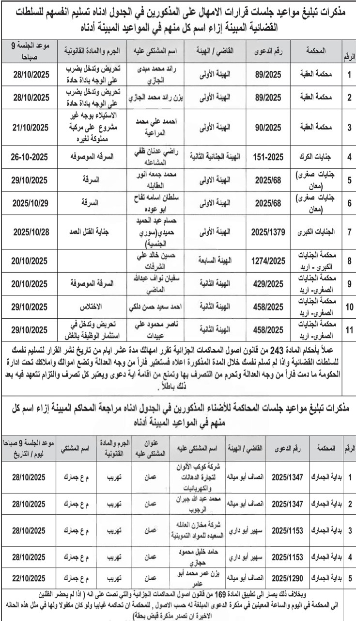الوقائع الإخباري:أصدرت الجهات القضائية، اليوم الاثنين 20 تشرين الأول 2025، مذكرات تبليغ لمواعيد جلسات محاكمة عدد من المشتكى عليهم والمتهمين والأظناء، إضافة إلى قرارات إمهال.
